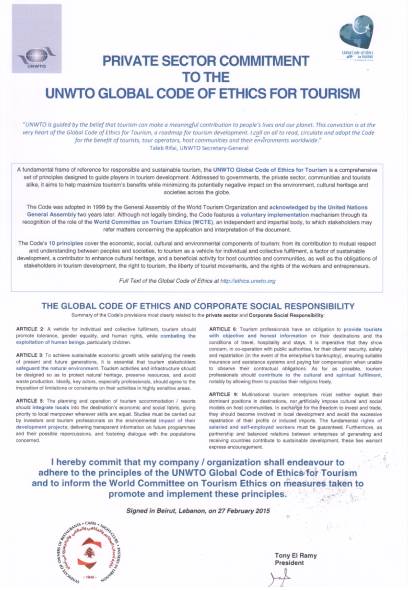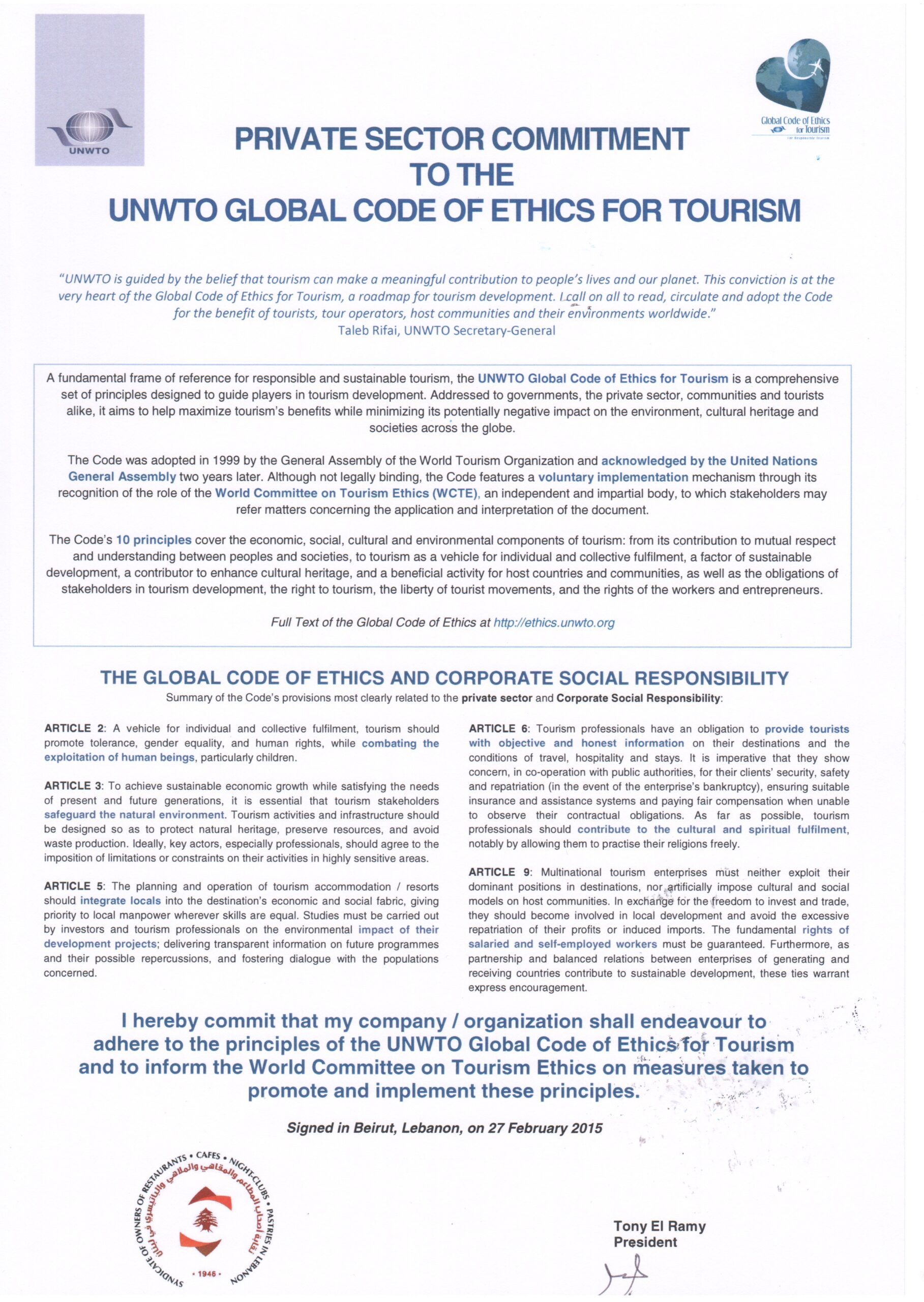 He is also committed to the Global Code of Ethics – United Nations World Tourism Organization.