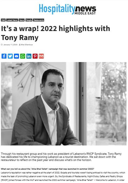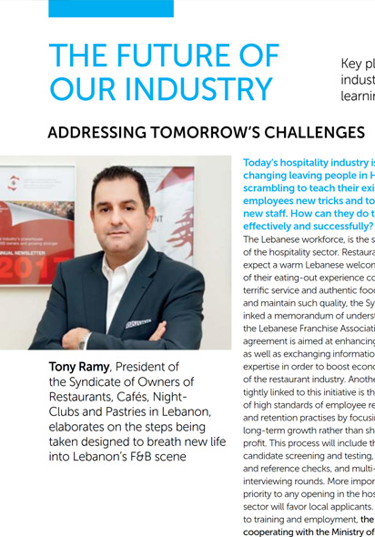 Tony Ramy has been the President of the Syndicate of Owners of Restaurants, Cafes, Night-Clubs & Pastries in Lebanon since 2014.